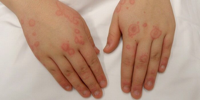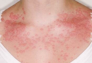 - Высыпания на открытых участках кожи разного цвета. Оттенок может варьироваться от бледно-розового до насыщенного красного.